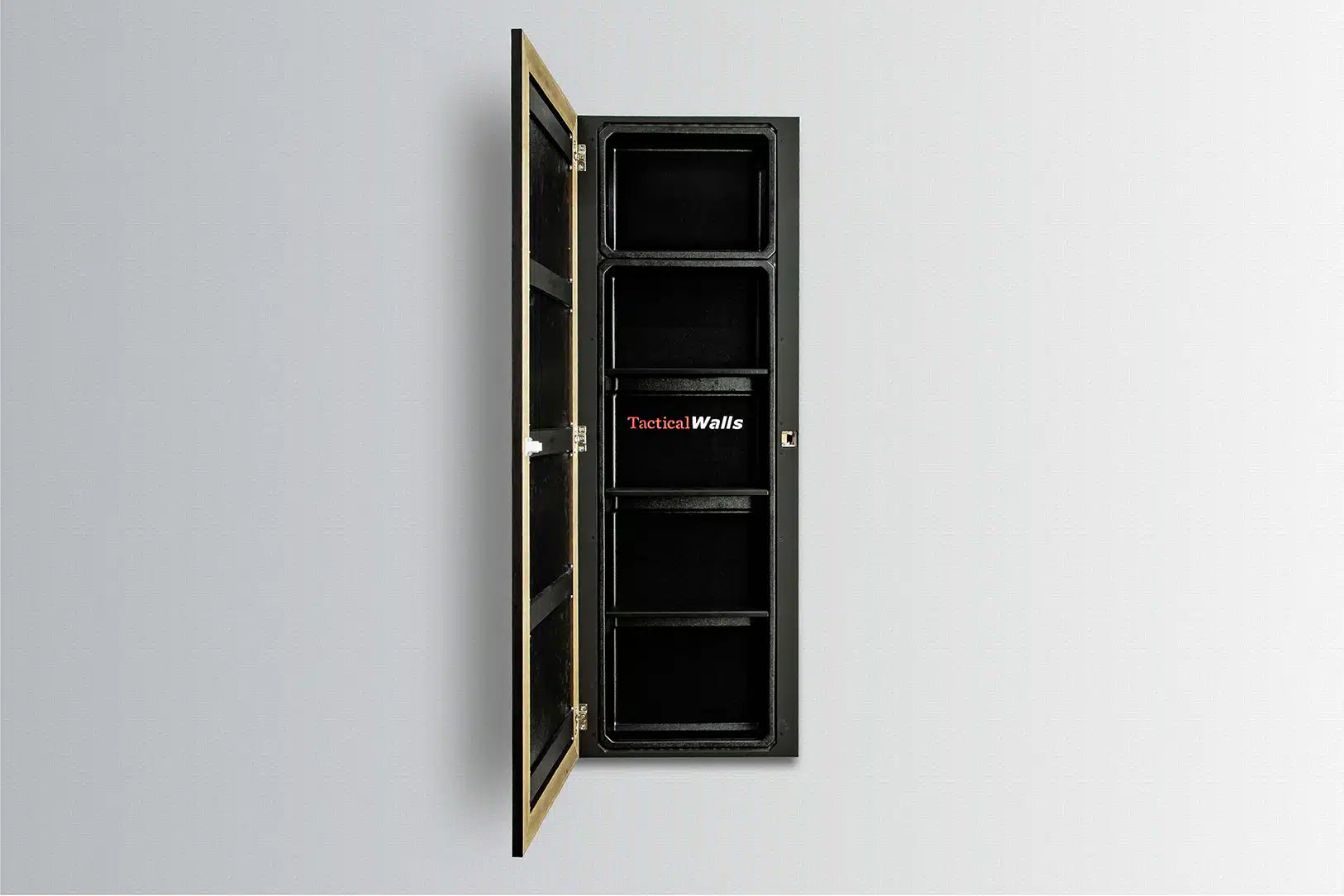 The 1450 Framed Concealment Mirror gives you discreet protection and everyday convenience in one beautiful piece of home décor. Designed to recess between standard 16″ wall studs, it protrudes only 1.25 inches from the wall, staying completely undetectable to guests and intruders. Behind the mirror are two spacious compartments, giving you room to securely store multiple handguns, two rifles, magazines, and emergency essentials. A magnetic locking system keeps everything safe yet ready within seconds when you need fast access.