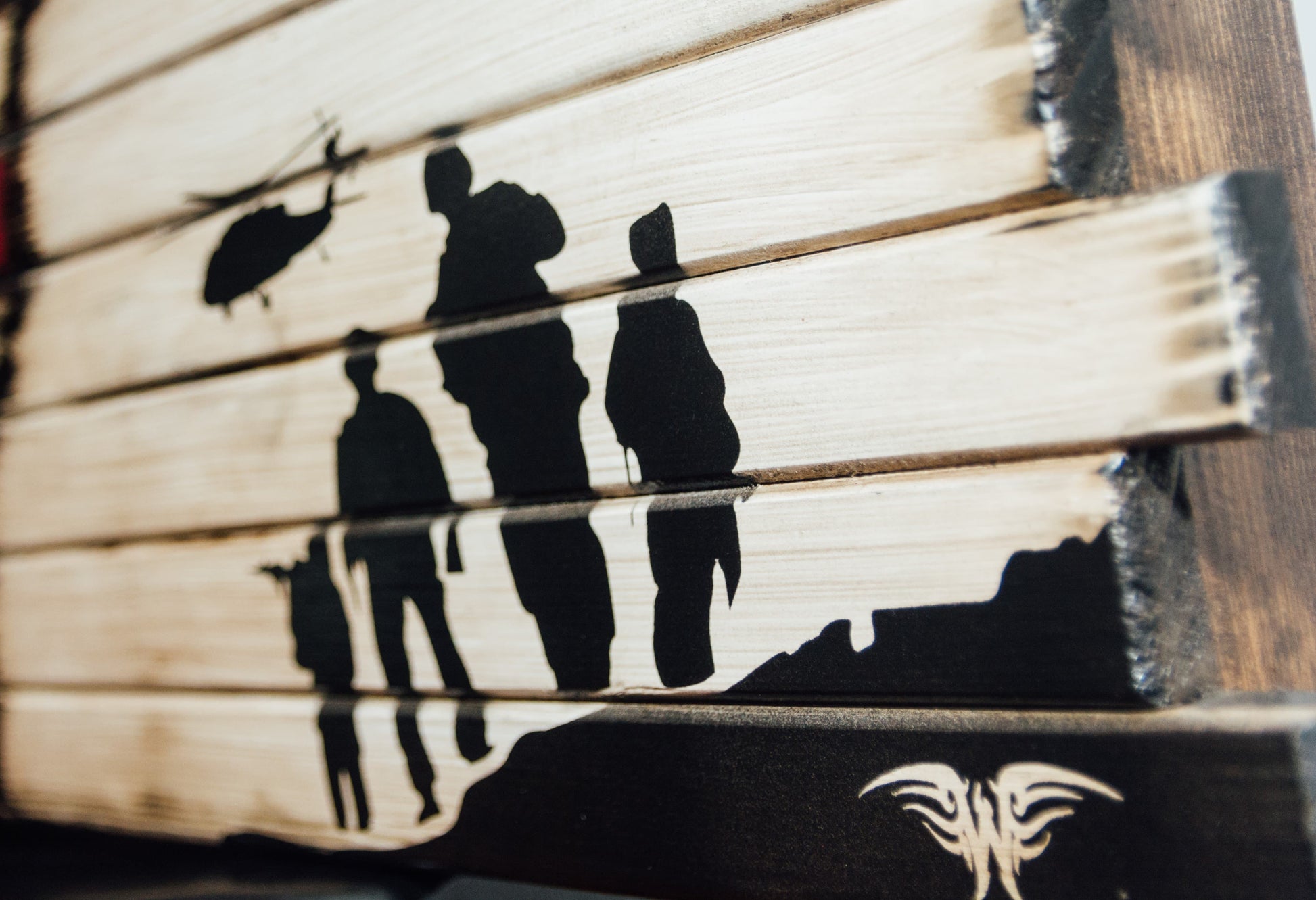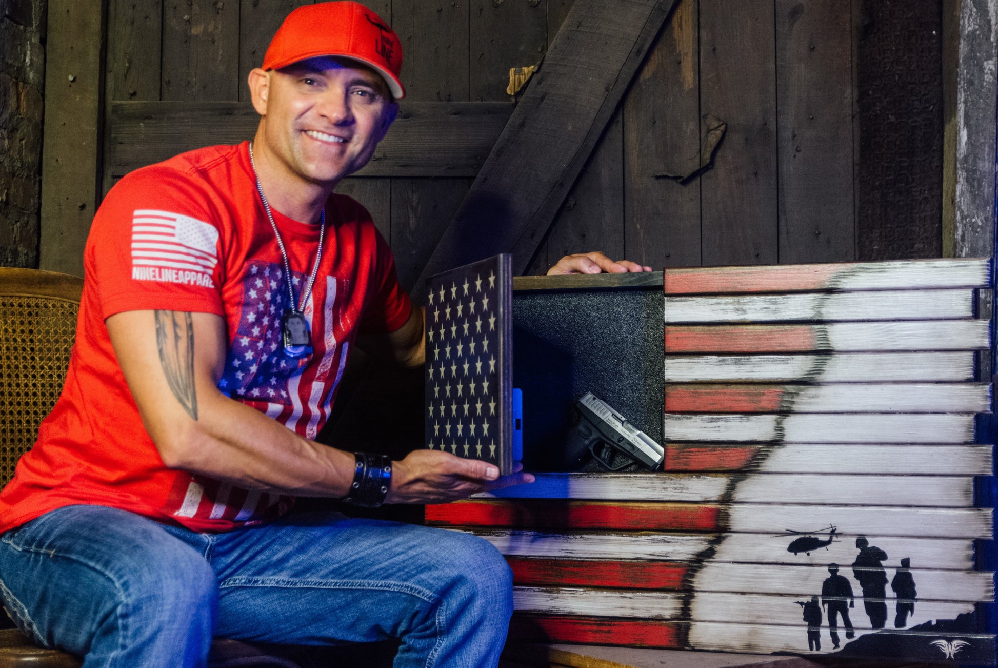 • Handcrafted American flag concealment cabinet with “Heroes in Arms” design