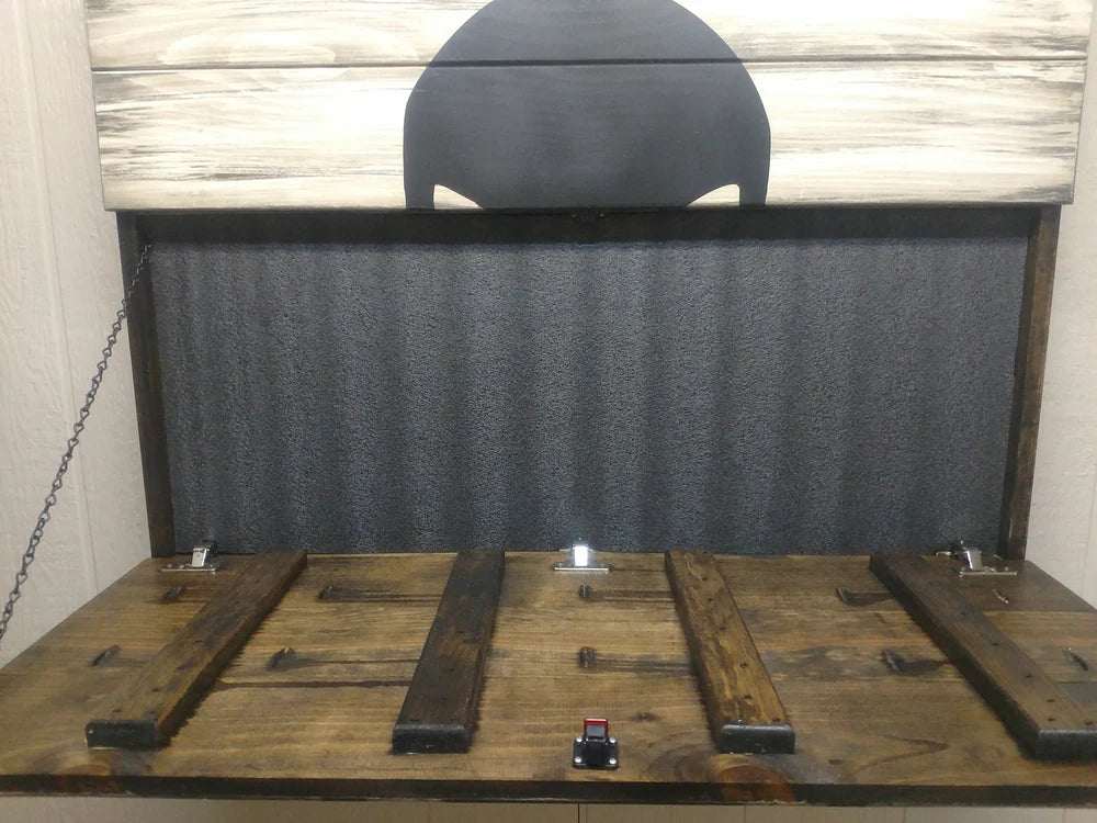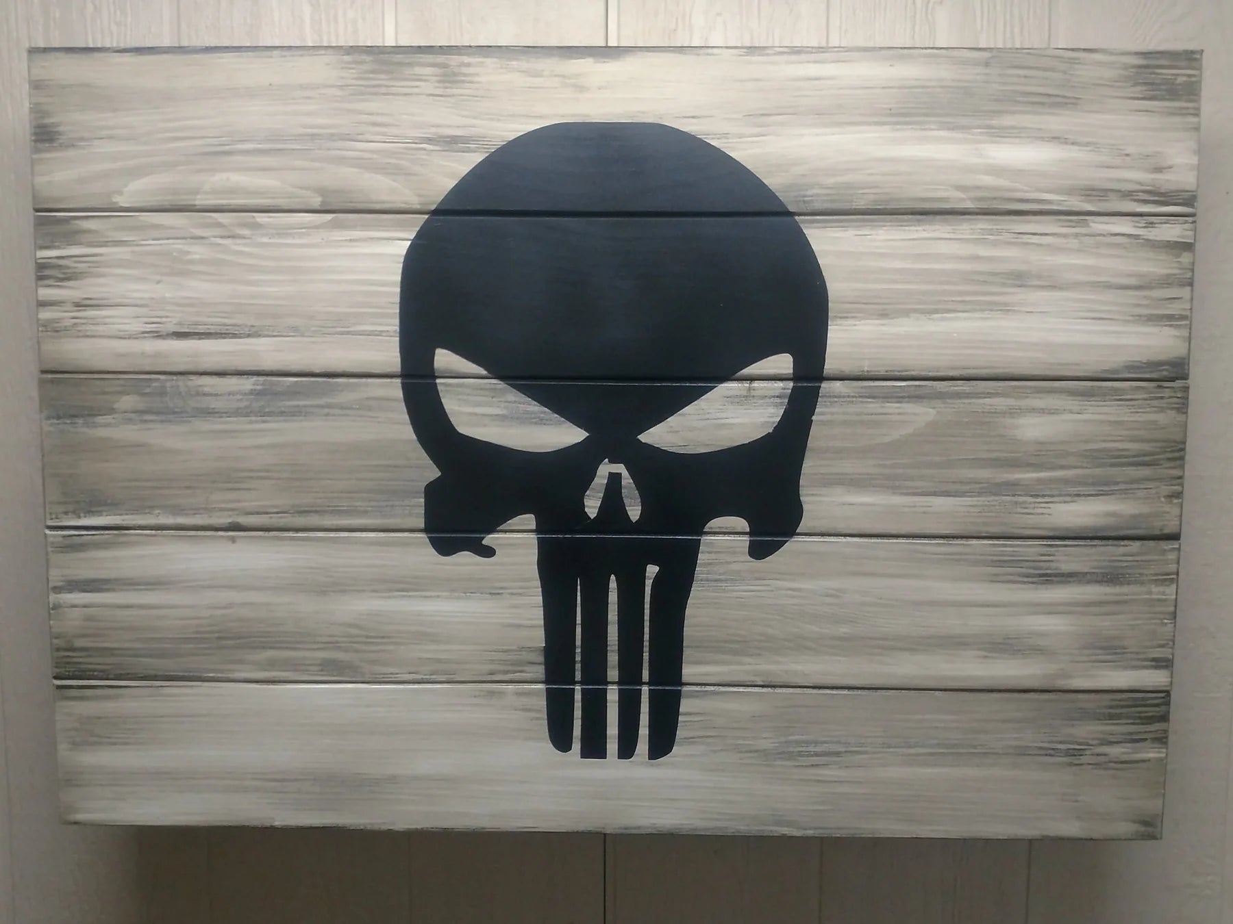 Our Punisher Skull hidden gun storage sign is perfect for military, law enforcement enthusiasts, or anyone who appreciates bold wall décor. Featuring a large black Punisher skull on a distressed white background, it combines striking style with secure functionality. The sign includes a lockable concealed compartment large enough to store firearms, including shotguns and semi-automatic rifles. Handmade in the USA, this piece also offers an optional RFID lock upgrade for enhanced security.
