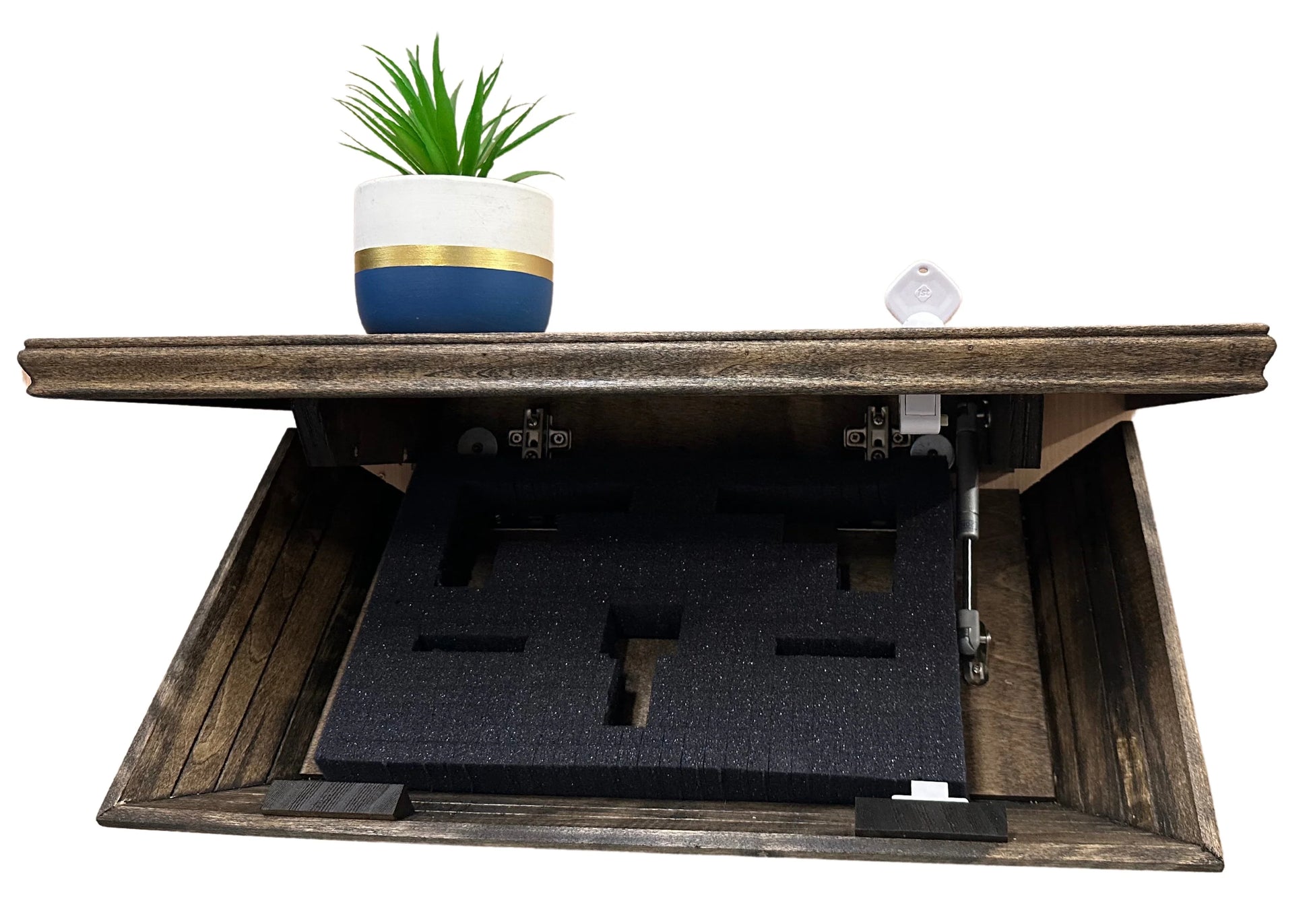 This handmade solid wood floating mantle shelf hides a drop-down compartment that securely stores your firearm and self-defense gear while looking like ordinary décor. Magnetic lock and customizable foam insert give instant, reliable access when you need it fully assembled and ready to mount.